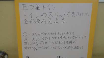 児童会代表委員の子どもたちが考えた「五つ星トイレ」の活動が始まりました。トイレのスリッパをそろえることを,楽しく意識できるような活動を考えてくれました。