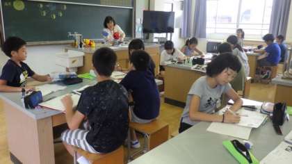 3年生は算数で,巻尺を使って長い長さを測る活動をしています。5年生は書写で,文字の組み立てに気をつけながら,毛筆で『朝日』と書く学習をしています。6年生は理科で,模型をみながら月の見え方と太陽の位置の関係について考えています。