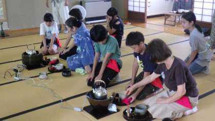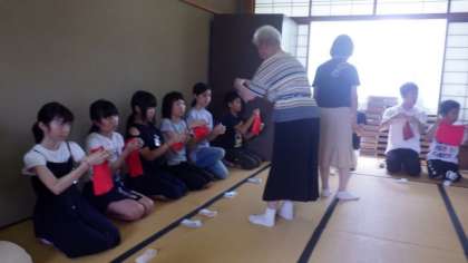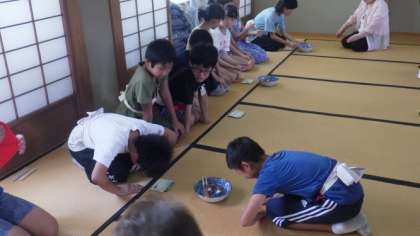6年2組の子どもたちが,2回目の茶道体験をしました。女性会の皆様,保護者の皆様にお世話になり,田中先生に作法を教えていただきました。お茶のたて方や,ふくさの作法などを教えていただきました。