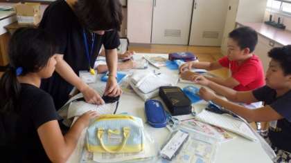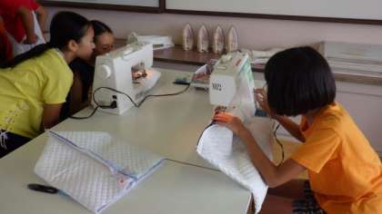 ミシンを使ってナップザックづくりをしています。今日は,ナップザックの出し入れ口を縫っています。