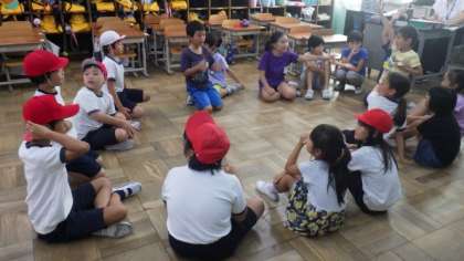 たてわり班で楽しく遊びました。今日はとても暑いので,体育館や運動場での遊びは中止して,教室で活動しました。
