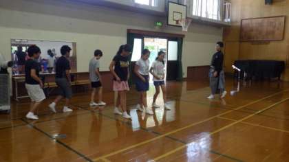 1回目で教えていただいた所作をおさらいしてから,「しびり」の演目を直接ご指導いただきました。主人と太郎冠者になりきって,台詞を言ったり所作をしたりして,狂言を楽しみました。