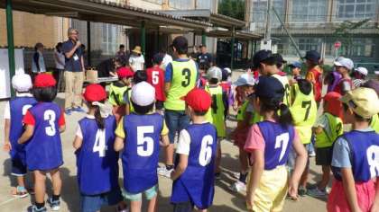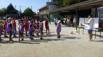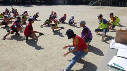 PTAの皆様にお世話になり,ブロック別球技大会が行なわれました。挨拶,キックベースボールのルール説明の後,6年生が準備運動を進めました。