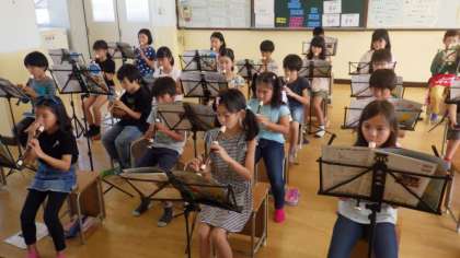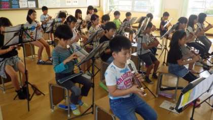 音楽室で学習しています。リコーダーの練習をがんばっています。