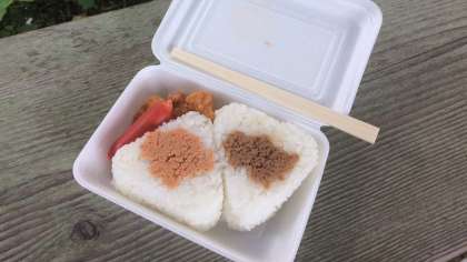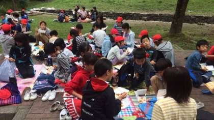 芝生でおにぎり弁当をいただきました。今日の活動は,3校合同出会いの会,野外炊事,天体観測を予定しています。