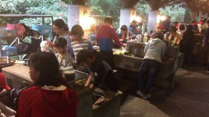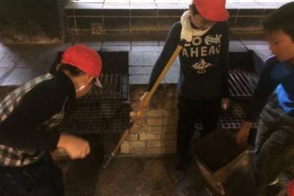 夕食が終わり,片づけをしています。グループで協力して,洗い物やかまどの片づけなどをしています。