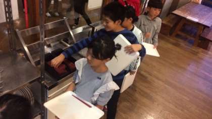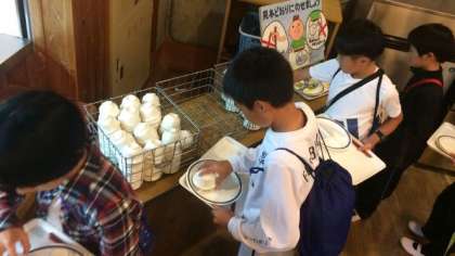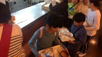 初めての食堂での夕食です。食堂では,並んで順番におはしや皿,デザート,汁物を受け取った後,おかずを選んでとります。