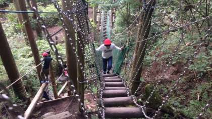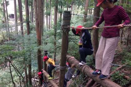 昼食の後から魚さばきの活動までに時間ができたので,「冒険の森」で活動しています。いろいろなアスレチックに挑戦しています。