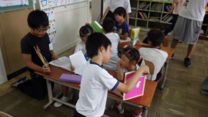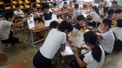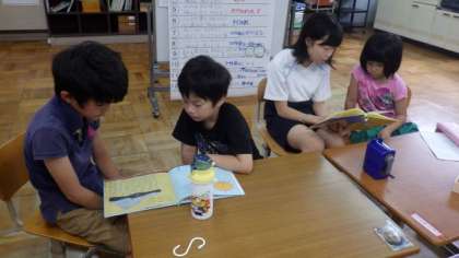 今朝のさわやかタイムは,たてわり読み聞かせを行いました。1年生と6年生,2年生と5年生,3年生と4年生で,たてわり読み聞かせをしています。低学年の子どもたちに,読書ノートの記録の仕方を教えている高学年の子どもたちの優しい姿が見られました。