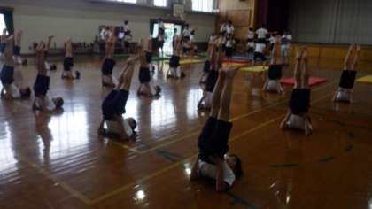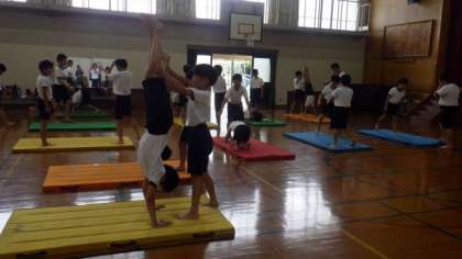 一人技や二人技の動きをそろえる練習をしたり,倒立などの技を練習したりしています。