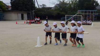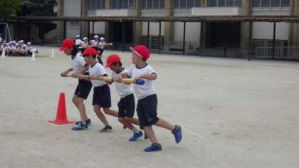 運動場で,団体競技「台風の目」の練習をしました。友達と協力して,棒をもってコーンを周回するのが,だんだん速くなってきました。