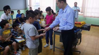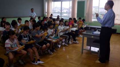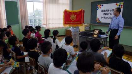 鳳徳消防分団の小川分団長をお招きし,消防分団についてのお話を聞きました。どんな活動をされているかなど,詳しく聞かせていただきました。また,日頃の訓練をがんばっておられることや,査閲で素晴らしい成績を残しておられることなども話してくださいました。子どもたちは,消防団の階級章も見せていただき,いろいろなことに驚いている様子でした。