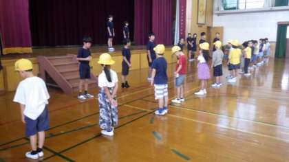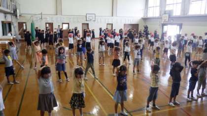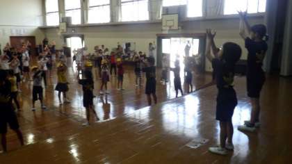 中間休みに赤組が運動会全校ダンスの練習をしました。全校ダンス・準備担当の5・6年生が手本になって,「パプリカ」の曲に合わせて練習しました。