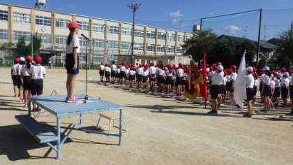 入場の後は開会式の練習をしました。児童会本部が中心となって,開会式を進めました。