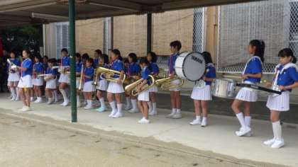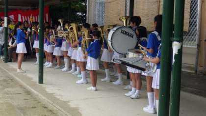 開会式が行われました。雨のため,金管バンドクラブは屋根の下で演奏を披露しました。