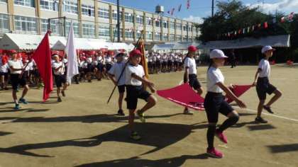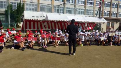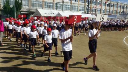 1・2時間目に全校練習を行いました。入場行進の練習から始めました。