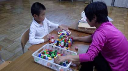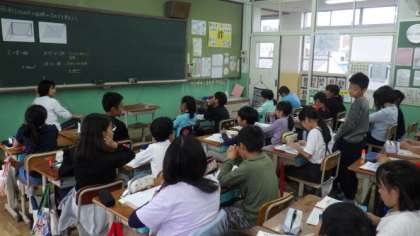 3組はブロックを使って活動しています。6年生は算数で,練習問題に取り組んでいます。5年生は算数で,平行四辺形の面積の求め方について考えています。