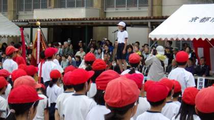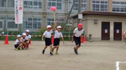 児童会の子どもたちを中心に,開会式を進行しました。開会宣言・校歌斉唱・優勝旗返還の後に,聖火リレーを行いました。