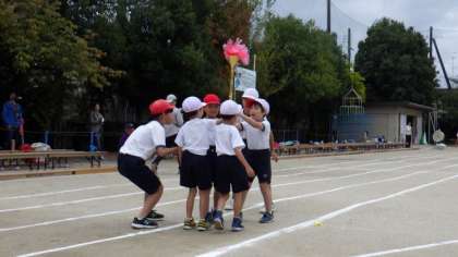 聖火リレーを順番にまわして走りました。係の高学年の子どもたちも優しく誘導していました。