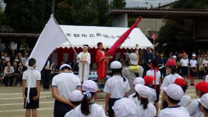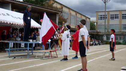 選手宣誓・各団のスローガン発表の様子です。団長が元気よく発表しています。