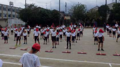 「パプリカ」の曲に合わせて,準備運動を行いました。