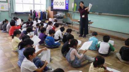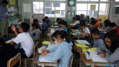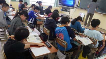 1年生は学芸会に向けて,みんなで台本を読んでいます。5年生は理科で,台風についての学習のまとめをしています。6年生は社会の歴史の学習で,資料を使って調べています。