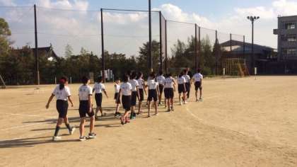 予選会会場の鷹峯小学校グラウンドに着きました。コースの確認やウォーミングアップをしています。