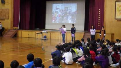 今日は,5年生が発表しました。5年生の代表4人が,花背山の家長期宿泊学習での思い出についてスピーチをしました。