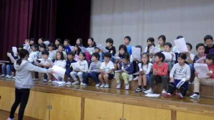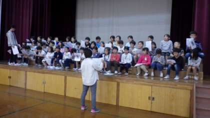 体育館で学芸会練習をしています。音読劇「ちいちゃんのかげおくり」の歌を練習したり,台本を見て台詞を確認したりしています。