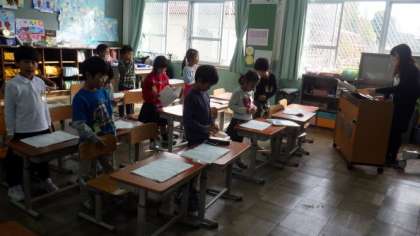 1年生は学芸会で「大きなかぶ」の劇を発表します。音楽の時間に「大きなかぶ」の歌を練習しています。