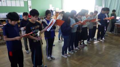 6年生は教室で,劇中の歌を練習しています。2年生は教室で,振りも入れながら楽しく劇中の歌を練習しています。1年生は体育館で,舞台の並び方を確認しています。