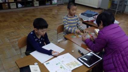 1年生はパズルを使って学習しています。3年生は算数で,計算の練習をしています。