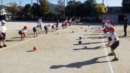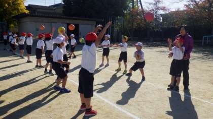 ペアになって,ボールのいろいろな投げ方・受け取り方を練習しています。友達のボールを上手に受け取ると,一緒に喜んでいました。