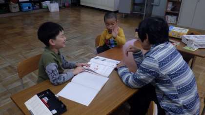 算数の問題場面の挿絵を見て,問題を自分で考えています。