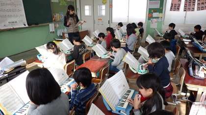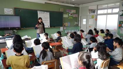 「会えて よかった」の曲をクラスみんなで「呼びかけ」役と「こたえ」役に分かれて歌ったり,鍵盤ハーモニカを演奏したりしています。