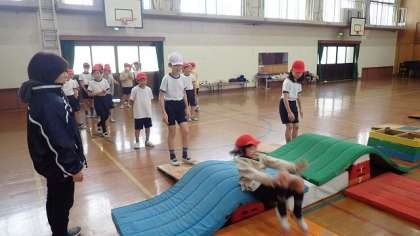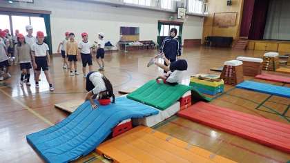 1組は,体育館でとび箱運動の学習に取り組んでいます。1段のとび箱から台上前転の練習を始めています。