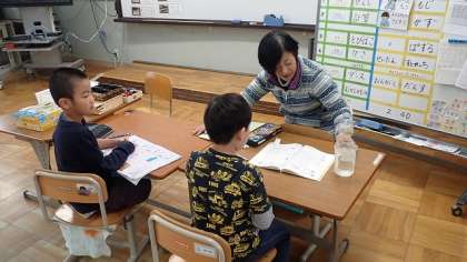 3組では,かさの単位『dL』について学習したり,ひらがなの書き方を練習したりしています。