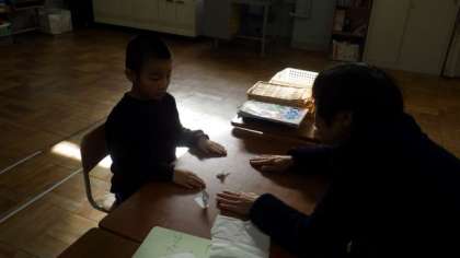 紙で作った人形を使って,先生と活動しています。