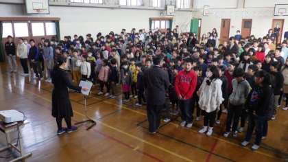 終業式の後に,「ほかほかコンサート」に向けて全校合唱の練習をしました。