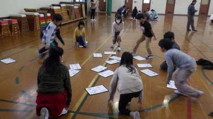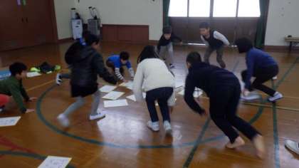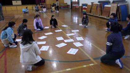 4時間目は,4年生が新春ジャンボカルタ大会を行いました。女性会の皆様が作ってくださったジャンボカルタを使って,白熱したカルタ大会になりました。