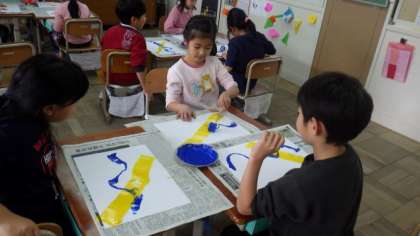 今日は,ローラーに絵の具をつけて転がすとどんな形や線ができるか,いろいろ試しています。