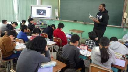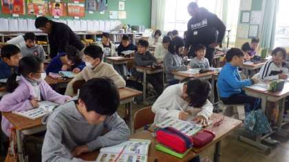 世界のいろいろな国について紹介する活動をしています。ALTの先生の話を聞いて,どの国の,どんなことを紹介しているか考えたり,紹介したい国についてノートにかいたりしています。
