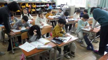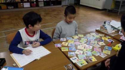 3組は,算数の問題に取り組んだり,カルタで文字の学習をしたりしています。1年生は算数で,計算の文章題や問題づくりに挑戦しています。