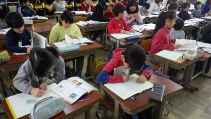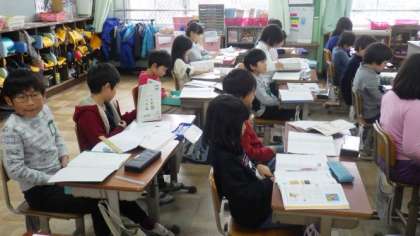 長さの練習問題に取り組み,自分で丸つけをしています。