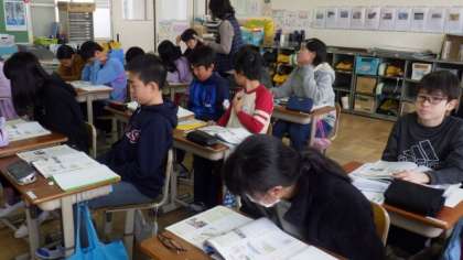 1年生は国語で,漢字の練習をしています。6年生は社会で,日本国憲法の働きについて学習しています。