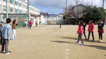 今日の昼休みは雨があがったので,運動場でたくさんの子ども達が遊んでいました。もうすぐ行われる大なわ大会の練習をするクラスもありました。