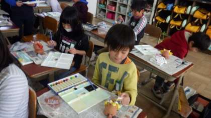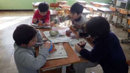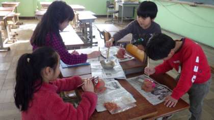 自分だけのシーサーに色をぬったり,仕上げにニスをぬったりしています。もうすぐ作品の完成です。