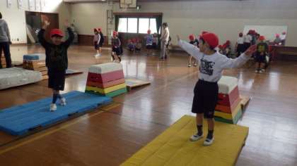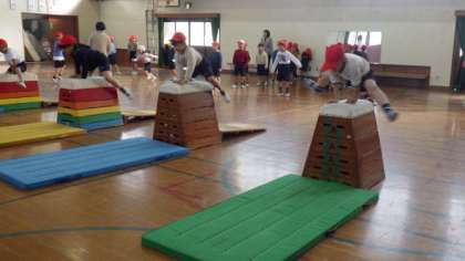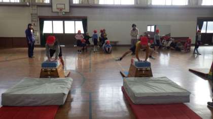 開脚とびの練習をしています。高い段にチャレンジする子ども達もいました。