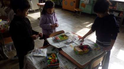 粘土を使って,おべんとうの中身をつくっています。友達とうれしそうにお話ししながらつくっています。
