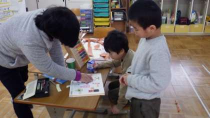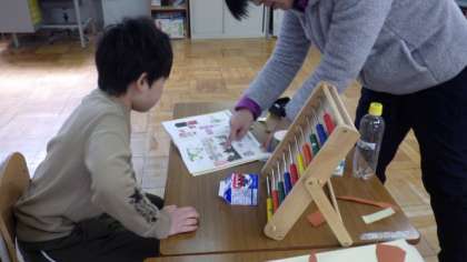 算数で,かさの学習をしています。